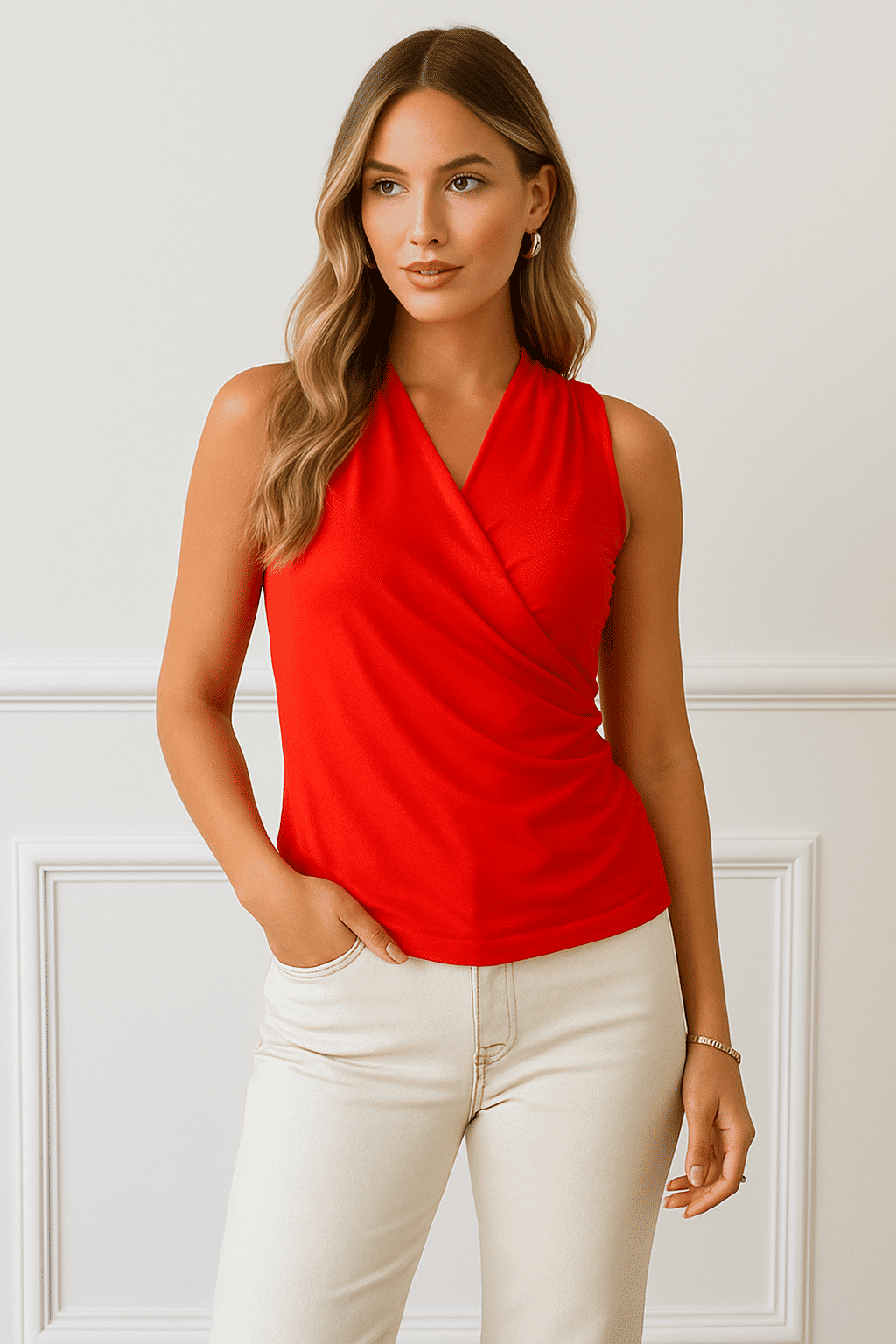 A Blusa Bella é uma peça feminina versátil, que une praticidade e sofisticação em um design moderno. Seu decote transpassado em V valoriza o colo de forma elegante, enquanto as pregas laterais criam um caimento ajustado que realça a silhueta com conforto. Sem mangas, é ideal para dias mais quentes ou para compor sobreposições com blazers e jaquetas.